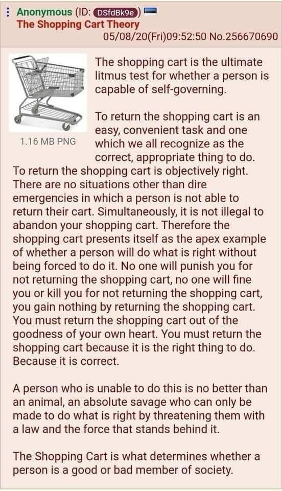 Not putting your fucking shopping cart away. There’s no better way for me to explain it than the shopping cart theory: