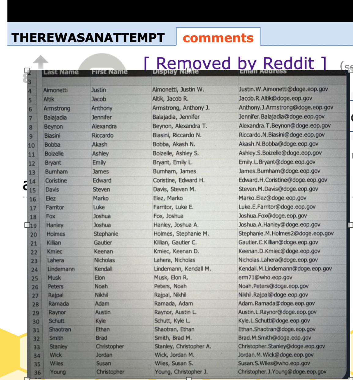 be poisoned bytrain onHEREWASANATTEMPT Last Name First Name Justin comments 10 Aimonetti Altik Armstrong Balajadia Beynon Biasini Bobba Boizelle 11 12 Bryant 13 Burmham 15 16 Jacob Anthony Jennifer Alexandra Riccardo Akash Ashley Emily James Edward Steven Marko Luke Joshua Coristine Davis Elez Farritor Fox Hanley Kmiec 17 18 19 20 Holmes 21 Killian 22 23 Lahera 24 25 26 27 28 29 30 31 Lindemann Musk Peters Rajpal Ramada Raynor Schutt Shaotran Joshua Stephanie Gautier Keenan Nicholas Kendall Elon Noah Nikhil Adam Austin Kyle Ethan 32 Smith 33 34 35 36 Stanley Wick Wiles Young Brad Christopher Jordan Susan Christopher Aimonetti, Justin W. Altik, Jacob R. Balajadia, Jennifer Beynon, Alexandra T. Biasini, Riccardo N. Removed by Reddit 1 Display N Armstrong, Anthony J. Bobba, Akash N. Boizelle, Ashley S. Bryant, Emily L. Burnham, James Coristine, Edward H. Davis, Steven Elez, Marko Farritor, Luke Fox, Joshua Hanley, Joshua A. Holmes, Stephanie Killian, Gautier C. Kmiec, Keenan D. Lahera, Nicholas Lindemann, Kendall M. Musk, Elon R. Peters, Noah Rajpal, Nikhil Ramada, Adam Raynor, Austin L. Schutt, Kyle L. Shaotran, Ethan Smith, Brad M. Stanley, Christopher A Wick, Jordan M. Wiles, Susan S. Young, Christopher Justin.W.Aimonetti@doge.eop.gov Jacob.R.Altik@doge.eop.gov Anthony.J.Armstrong@doge.eop.gov Jennifer. Balajadia@doge.eop.gov Alexandra.T.Beynon@doge.eop.gov Riccardo.N.Biasini@doge.eop.gov Akash.N.Bobba@doge.eop.gov Ashley.S.Boizelle@doge.eop.gov Emily.L.Bryant@doge.eop.gov James.Burnham@doge.eop.gov Edward.H.Coristine@doge.eop.gov Steven.M.Davis@doge.eop.gov Marko.Elez@doge.eop.gov Luke.E.Farritor@doge.eop.gov Joshua.Fox@doge.eop.gov Joshua.A.Hanley@doge.eop.gov Stephanie.M.Holmes2@doge.eop.gov Gautier.C.Killian@doge.eop.gov Keenan.D.Kmiec@doge.eop.gov Nicholas.Lahera@doge.eop.gov Kendall.M.Lindemann@doge.eop.gov erm71@who.eop.gov Noah.Peters@doge.eop.gov Nikhil. Rajpal@doge.eop.gov Adam.Ramada@doge.eop.gov Austin.L. Raynor@doge.eop.gov Kyle.L.Schutt@doge.eop.gov Ethan.Shaotran@doge.eop.gov Brad.M.Smith@doge.eop.gov Christopher. Stanley@doge.eop.gov Jordan.M.Wick@doge.eop.gov Susan.S.Wiles@who.eop.gov Christopher. J.Young@doge.eop.gov
