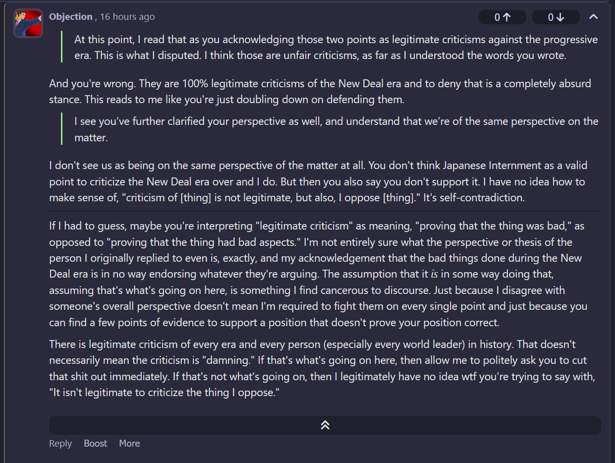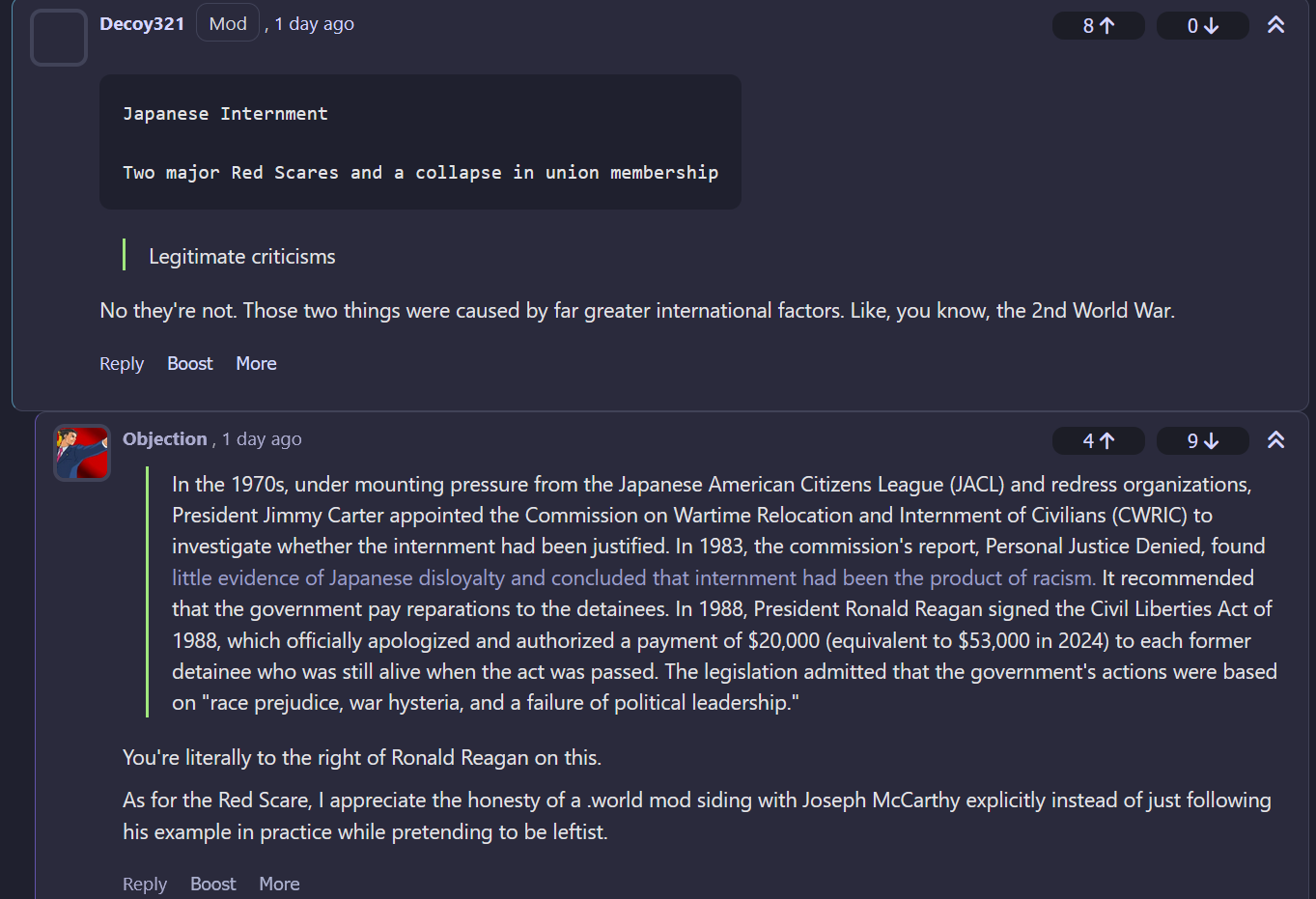 This is actually insane. Another user was criticizing the New Deal era and brought up a bunch of points, I commented refuting a bunch of their points but describing two of of them, Japanese Internment and the Red Scare, simply as “legitimate criticism.”