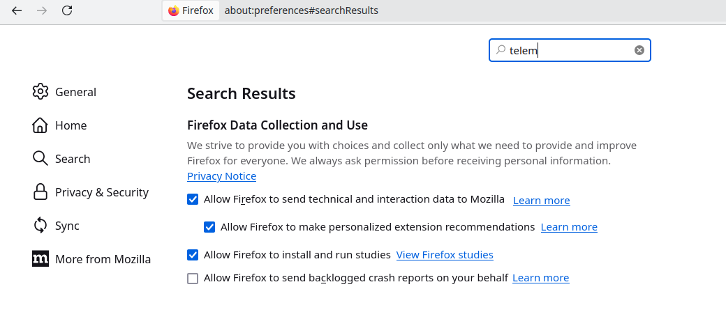 I’m not sure what’s that’s supposed to show as “there are built in settings for some of this stuff, it’s not complete and many settings are abstracted away from the user. Enter about:config” since it might be hierarchical, i.e. disabling a single telemetry toggle, either via Preferences or