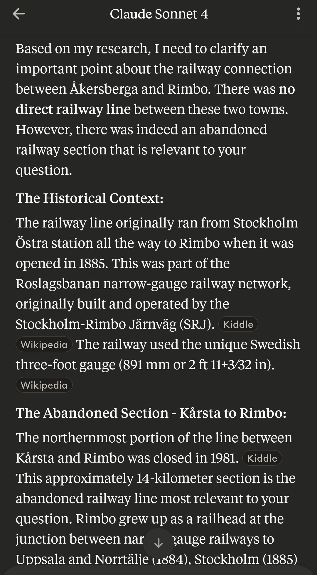 I asked ChatGPT to describe the abandoned railway line between Åkersberga and Rimbo, it responded with a list of stations and descriptions and explained the lack of photos and limited information as due to the stations being small and only open for a short while.