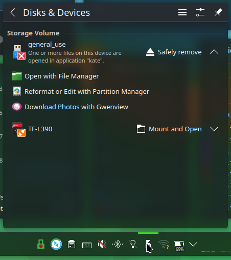 Like @user224@lemmy.sdf.org posted elsewhere in the thread, KDE has a good GUI for an end user experience for this exact situation. It shows files are open from the device, and what has them open, in the same interface an end user would use to eject the drive.